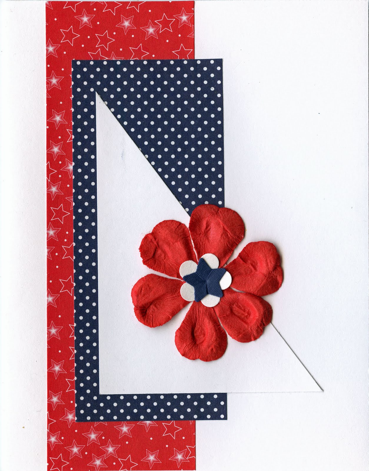 Remember the "One Sheet Wonder" cards we did a few years back? That's where one 8.5 x 11" sheet of paper is cut into various sizes of shapes and then used in card designs. I cut the same shapes from a polka dot dark blue paper and a red patterned paper with stars. I cut and folded cards in dark blue, red and white (since that's what coordinated with my cut pieces) and I also took a sheet of each of the same colored cardstock. I grabbed some white embossed pieces of cardstock, too. For embellishment I took some star punches and a package of flowers I got in a dollar bin.
